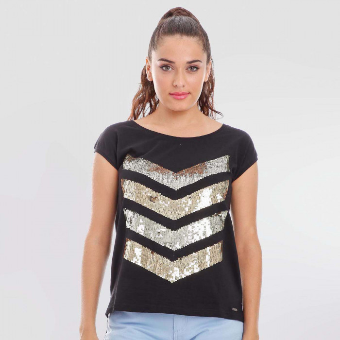 Camiseta manga corta con diseño frontal con lentejuelas doradas.